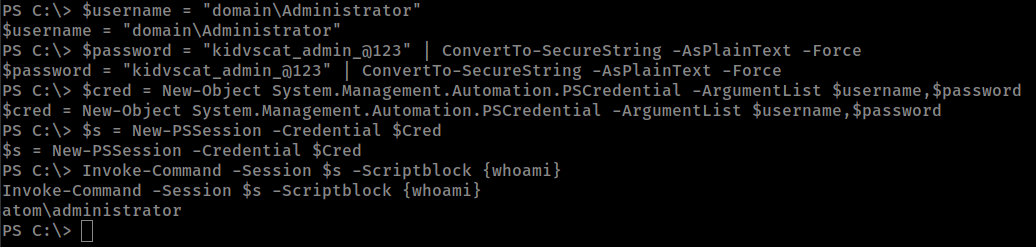 Invoke-Command -Session $s -Scriptblock {whoami}