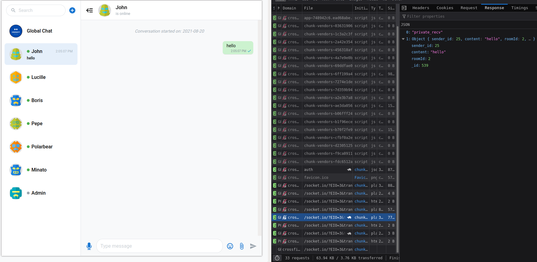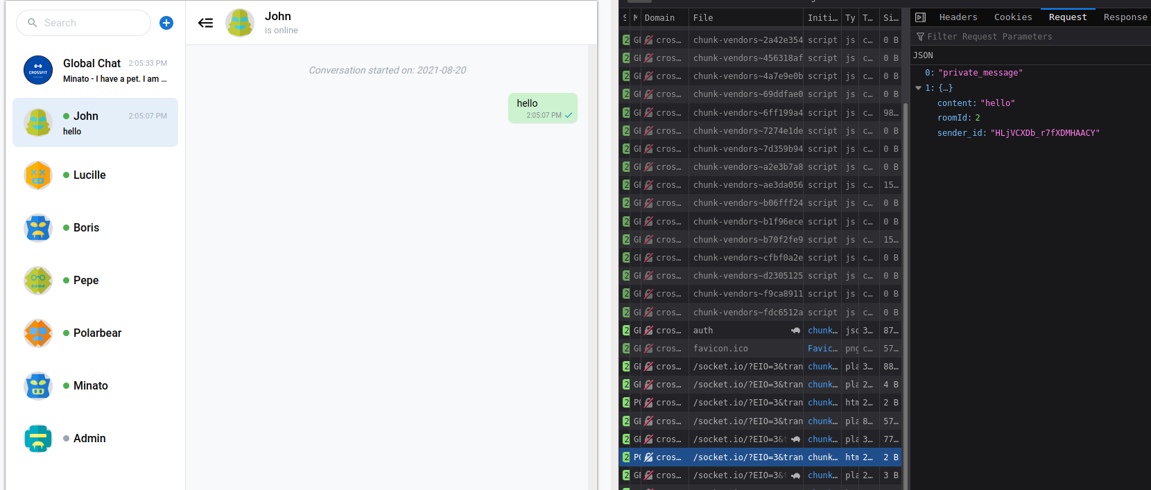 Chat function is using socket.io javascript api library.