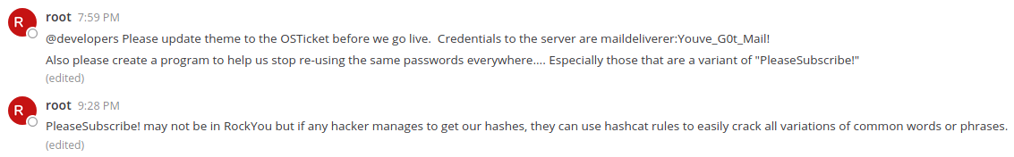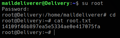 root@Delivery:~# cat note.txt I hope you enjoyed this box, the attack may seem silly but it demonstrates a pretty high risk vulnerability I've seen several times. The inspiration for the box is here: - https://medium.com/intigriti/how-i-hacked-hundreds-of-companies-through-their-helpdesk-b7680ddc2d4c Keep on hacking! And please don't forget to subscribe to all the security streamers out there. - ippsec