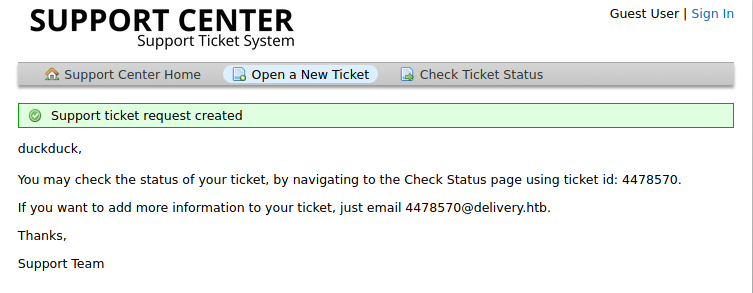 http://helpdesk.delivery.htb/open.phpwhen open a new ticket it gives an ticket number and email address.![]()