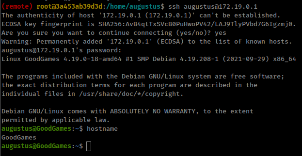 root@3a453ab39d3d:/home/augustus$ ssh augustus@172.19.0.1