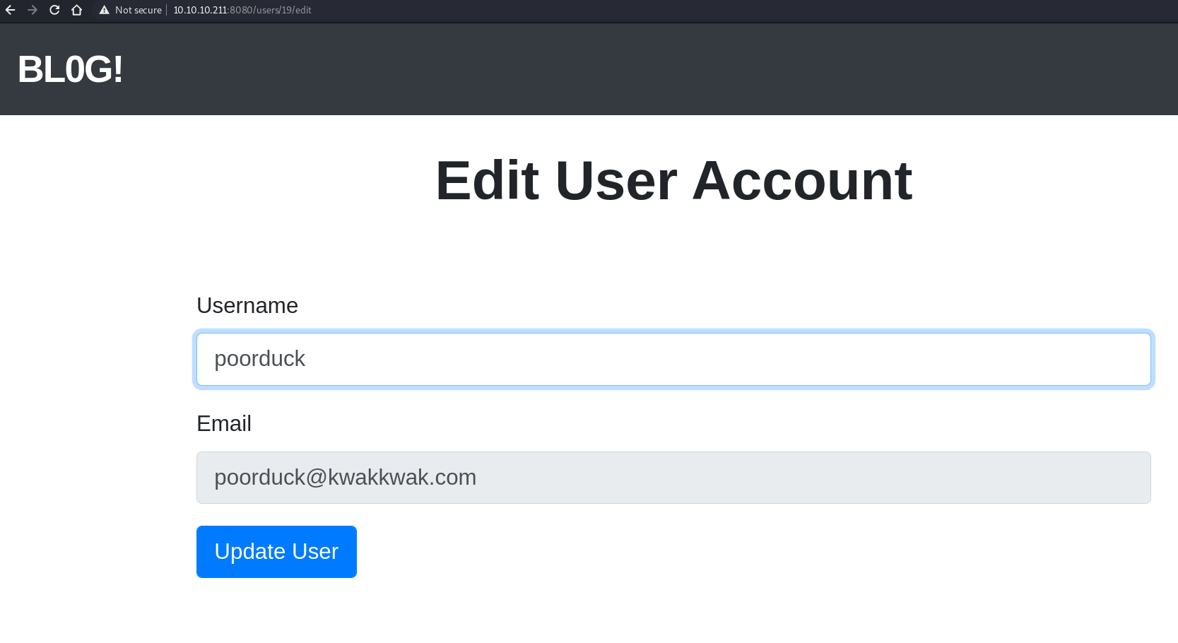 If we go to 10.10.10.211:8080 there is a signup option and create an account and go to profile there is a username update option