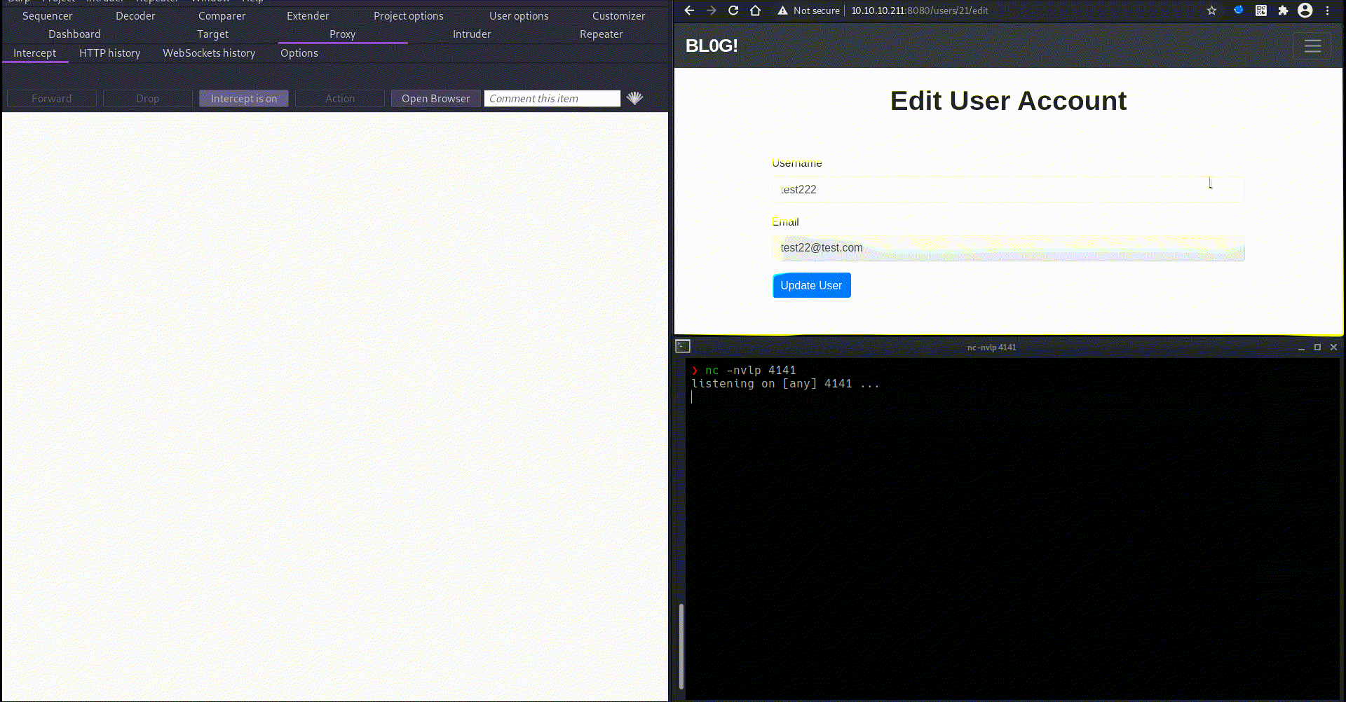 start netcat, intercept the username update request in burp, past payload in username field and forward the request and then refresh the page and payload get execute and we get shell.