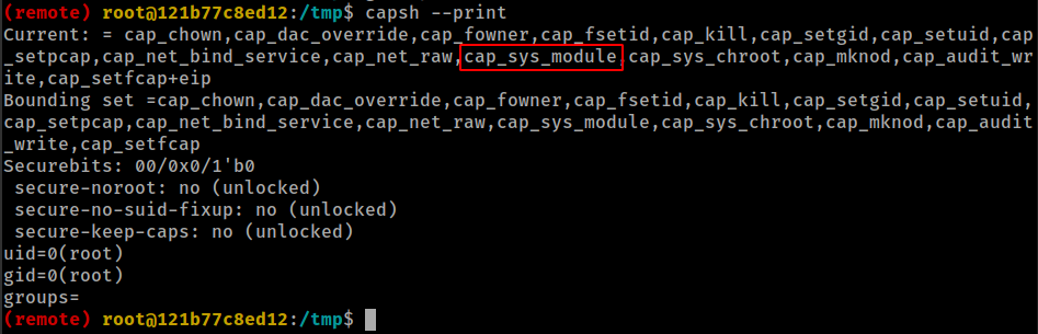 - CAP_SYS_MODULE: This means that you can insert/remove kernel modules in/from the kernel of the host machine.