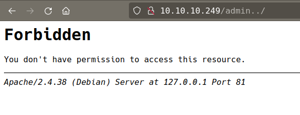 ❯ gobuster dir -u http://10.10.10.249/admin../ -w /usr/share/seclists/Discovery/Web-Content/raft-small-directories.txt -t 100