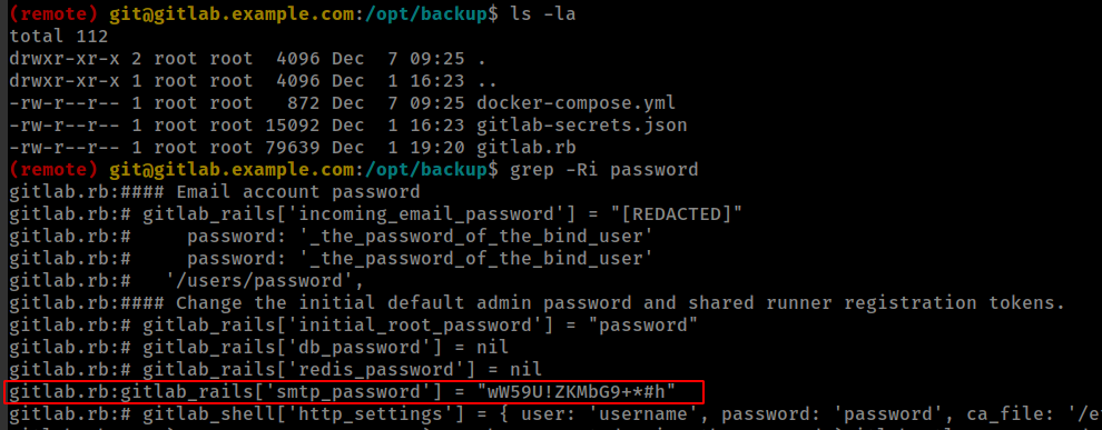 Found gitlab config file backup in /opt/backup/ directory and password.