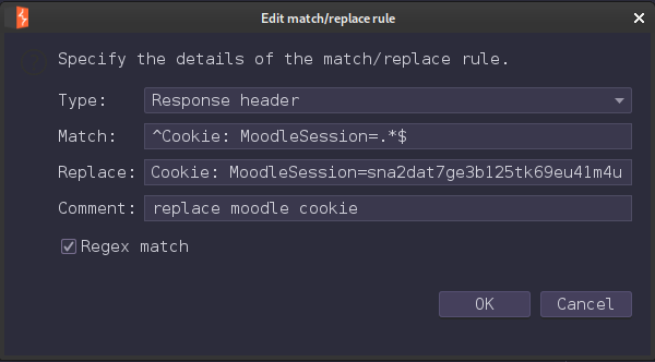 than setup “match and replace” rule to replace cookie value.