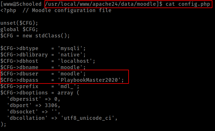 After some manual enumeration found moodle directory and get the db creds from config.php file