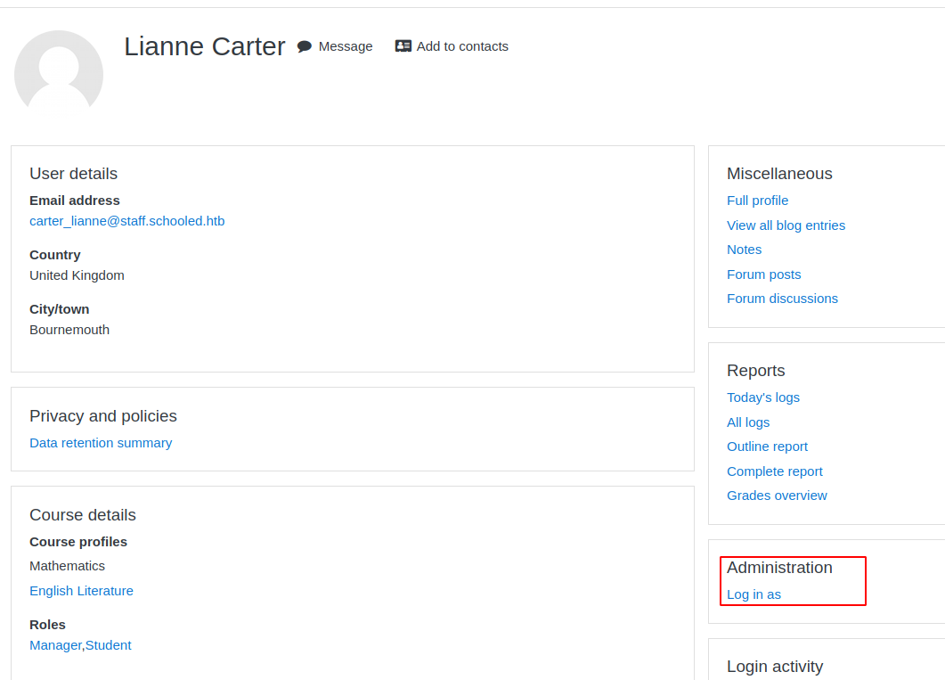 Admin panel - http://moodle.schooled.htb/moodle/login/