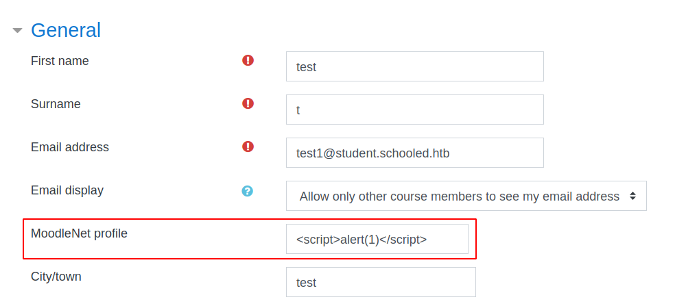 CVE-2020-25627: moodlenetprofile field in user profile is vulnerable for xss. which found http://moodle.schooled.htb/moodle/user/edit.php after creating student account.