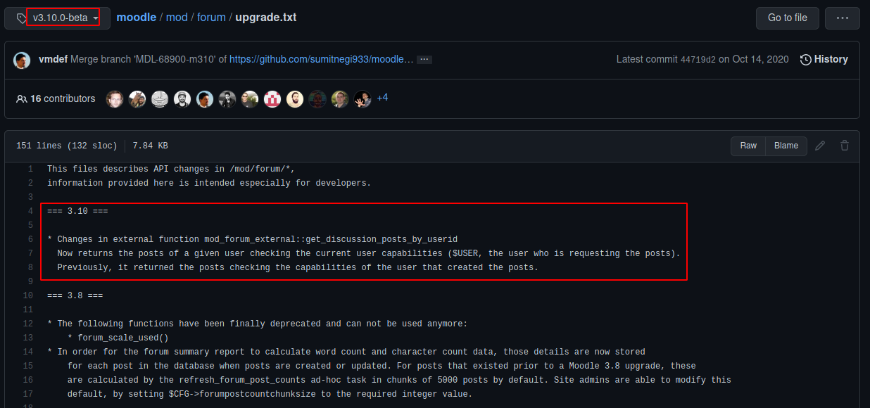 droopescan found version 3.10.0-beta but if we compare /mod/forum/upgrade.txt changelogs with original v3.10.0-beta from github repo there is something missing