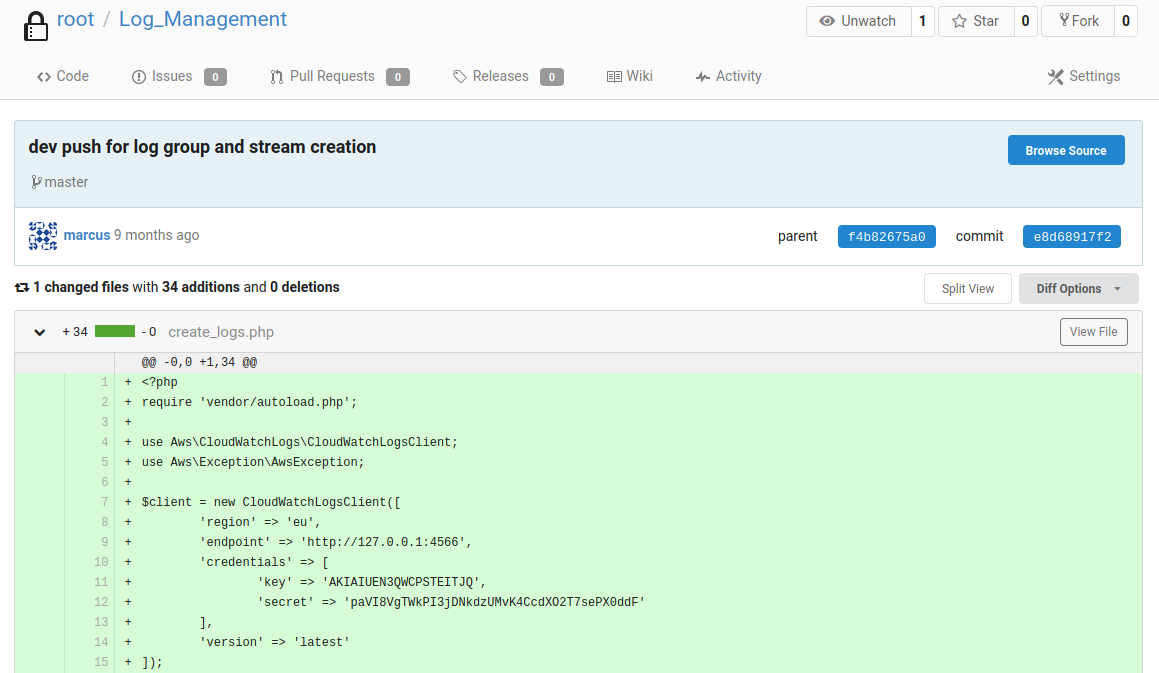 Found some aws secret from http://10.10.10.225:3000/root/Log_Management/commit/e8d68917f2570f3695030d0ded25dc95738fb1ba commit in root’s “Log_Management” repository.
