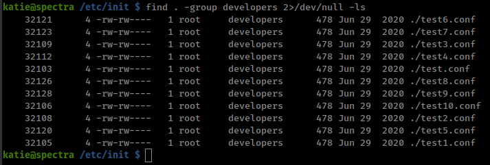 uid=20156(katie) gid=20157(katie) groups=20157(katie),20158(developers)