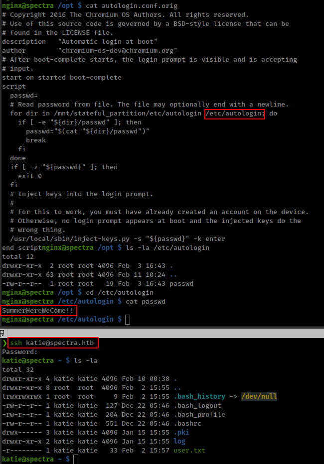 Found a conf file autologin.conf.orig in /opt directory which reads password from multiple folders. From /etc/autologin get new password which worked for user “katie” in ssh login.