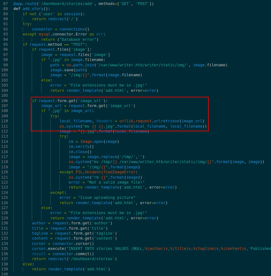 /var/www/writer.htb/writer.wsgi is a python script that initiating python web app form __init__.py file found from the comment.