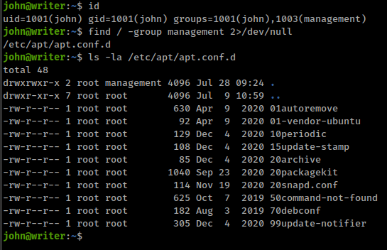 That means user “john” can write inside /etc/apt/apt.conf.d directory