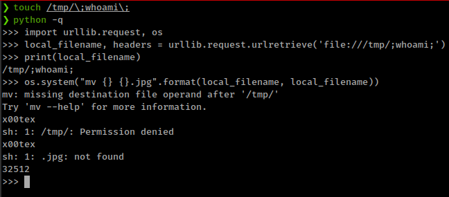 local_filename, headers = urllib.request.urlretrieve('file:///tmp/;whoami;')