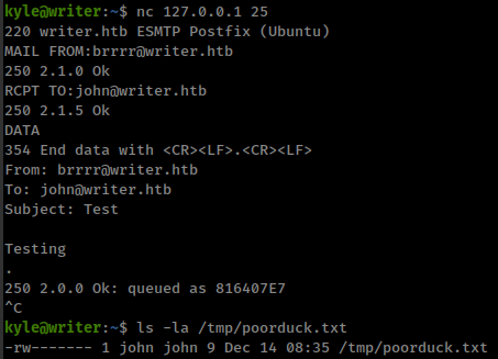 So, we have everything, postfix server and script that execute by user “john” and writable by user “kyle”.